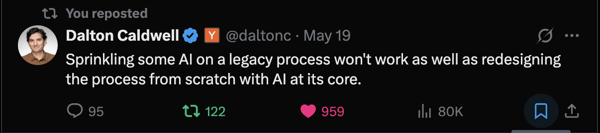 The CEO of Apify told me the simple version of this, “build the version of the product that AI is better than humans at.” Code is a perfect example of this.