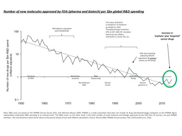I have a general macro thesis that there will be a lot more startup founders in the years to come, and that biotech is one of the areas that will come to rise. We saw it in software, because anyone can learn to code in 6 months and build an app with operating leverage to scale to millions. That isn’t the case for biotech due to a variety of headwinds that I am hoping change in our lifetime: FDA and Eroom’s law (see image), the need for domain expertise and the difficulty of acquiring it, IP, university institutionalized research and the replicability crisis, etc. The FDA continues to increase the barrier of entry to company formation in biotech as innovation gets easier.