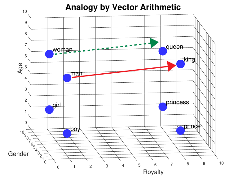 When I ask you to find the answer to King - Man + Woman, you can probably figure it out. You have an idea of the individual characteristics of each. These words are not too abstract so it’s pretty easy. Maybe you can think of some of the above features like Royalty, Masculinity, etc.