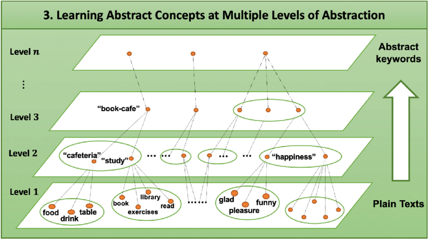 What is more complex is each of these concepts are represented by smaller concepts that are then represented by smaller concepts. As nuance improves, this complexity is captured better. Embeddings are used to capture the semantic meaning of entire documents today.