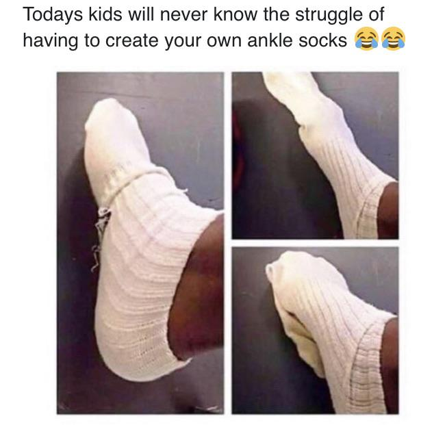 Today, if you wear ankle socks, you look old. Human desire to fit in repeats over time in a flat circle of fashion.