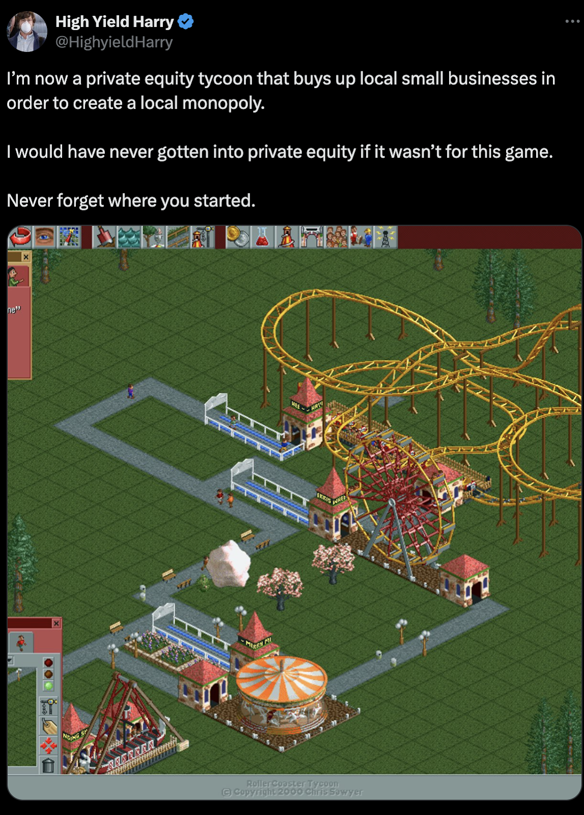 There is a meme that Roller Coaster Tycoon inspired the private equity giants of today.
