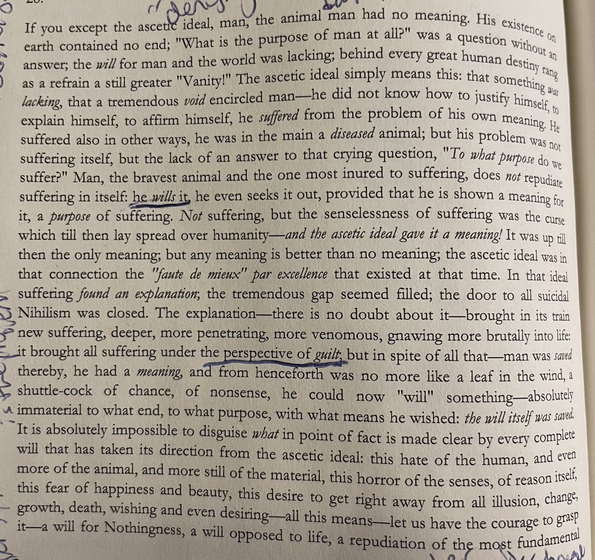 It is insufficient to simply recognize this lack of purpose, it is actually harmful. Nihilism unguided leads to man being lost in his world, and then to suicidal tendencies. He suffers from the void of his own meaning. The problem is the end. Why does man suffer? He will not suffer aimlessly, there must be a meaning. In fact, man invites suffering and often runs towards it. Of this era, Dostoevsky also writes, “Man is sometimes extraordinarily, passionately, in love with suffering.”